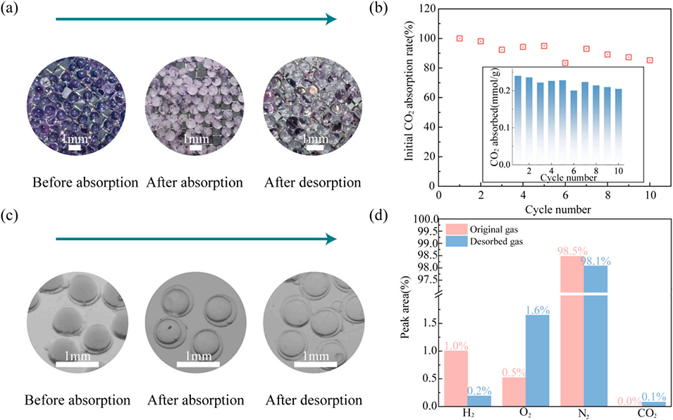 图7. MECS@Na₂CO₃-MEA的吸附-解吸循环测试图。(a)循环过程中MECS内部结晶变化图;(b)主图展示MECS初始吸收速率随循环次数的变化,插入子图量化10次连续循环后的吸收容量保留率;(c)高速相机拍摄的MECS在未吸附、吸附、解吸状态下的形貌演变图;(d)通过气相色谱(GC)对MEC热解吸释放气体组分的定量分析图。