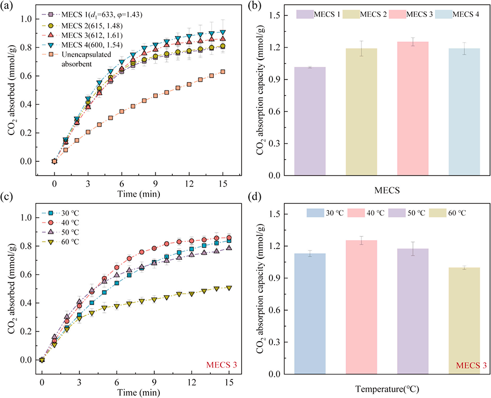 3、在0.7 atm、40°C条件下,MECS@Na₂CO₃-MEA的吸收容量比未封装吸收剂提高36%,且在低CO₂浓度(1-5 vol%)下仍保持33–57%的性能提升。