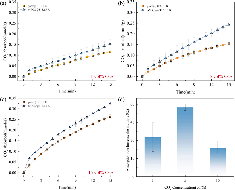 图6. 低浓度条件下MECS@Na₂CO₃-MEA的CO₂吸收性能图。(a)CO₂浓度为1vol%时的吸收速率曲线;(b)CO₂浓度为5vol%时的吸收速率曲线;(c)CO₂浓度为15vol%时的吸收速率曲线;(d)与未封装吸收剂相比的吸收速率提升比例图。