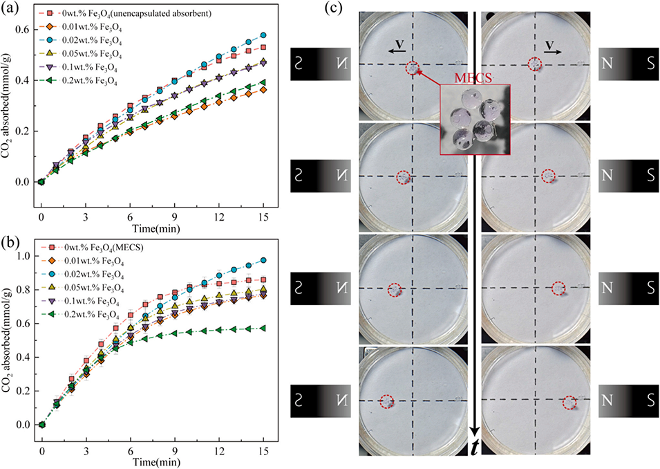 图8. 纳米Fe₃O₄浓度对MECS@Na₂CO₃-MEA与未封装吸收剂CO₂吸收性能的影响图。(a)纳米Fe₃O₄浓度对未封装吸收剂CO₂吸收性能的影响;(b)纳米Fe₃O₄浓度对MECS CO₂吸收性能的影响;(c)外部磁场下掺入纳米Fe₃O₄的MECS的定向调控图。