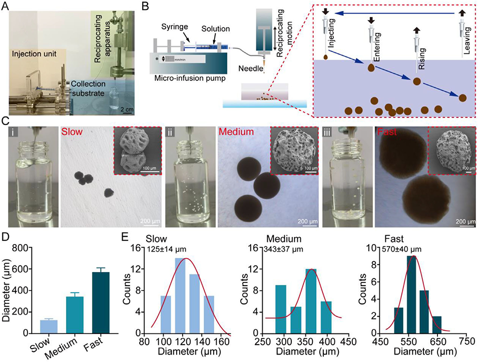 使用自制的微流控模拟装置,该装置主要包括:① 注射单元:装载有前体溶液的注射器,连接一个精密推注泵,用于精确控制溶液的推出速率。② 往复装置:带动注射器进行垂直的上下往复运动(频率为2 Hz)。③ 收集基底:一个装有石蜡油的容器,作为接收液滴的油相。