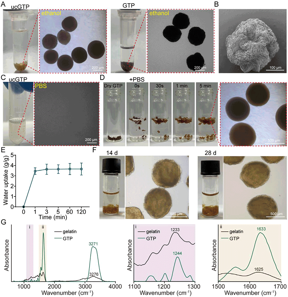 在推注泵的推动下,前体溶液通过金属针头被注入到石蜡油中。当溶液在针头末端与油相接触时,在界面张力和剪切力的作用下,会形成球状液滴。随着往复装置将针头向上移动,液滴在油相表面张力作用下与针头分离,并沉降到收集基底中,形成未交联的GTP(ucGTP)微球。通过调节推注泵的注射速率,可精确控制微球的直径。