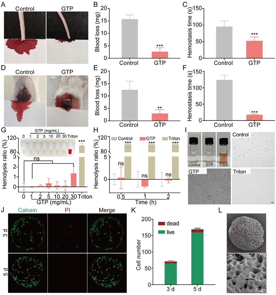 图5:明胶-茶多酚微凝胶的止血性能与细胞相容性