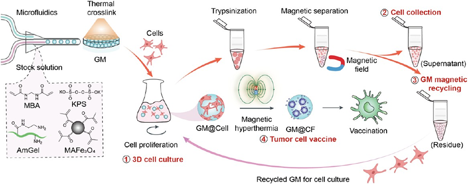 大规模3D细胞培养在疫苗生产、再生医学和药物开发中起着至关重要的作用。然而,目前用于大规模细胞培养的3D载体受到生产成本高、可重用性差和缺乏多功能性的限制。鉴于此,厦门大学化学化工学院何沙沙教授团队开发了一种基于磁性明胶微载体(GM)的多功能平台,该平台可实现高效3D细胞培养、磁辅助回收复用,并能在交变磁场下原位诱导肿瘤细胞免疫原性死亡以构建全肿瘤细胞疫苗,为肿瘤预防与免疫治疗提供了创新解决方案。相关研究以“Magnetic Microcarrier-Based Whole Tumor Cell Vaccines for Tumor Prevention and Immunotherapy”为题目,发表于期刊《ACS Nano》。