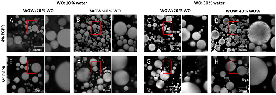 图2. 储存1天的水包油包水(W/O/W)乳液微观结构。该乳液由含4%(上排,A-D)或8%(下排,E-H)聚甘油蓖麻醇酸酯(PGPR)的初级乳液制备而成;初级乳液的水相比例为10%(左侧,A-B、E-F)或30%(右侧,C-D、G-H),且初级乳液在最终乳液中的占比为20%(A、E、C、G)或40%(B、F、D、H)。