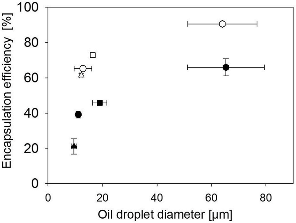 图5. 水包油包水(W/O/W)乳液(相比例12/28/60)的包封率与油滴粒径(经十二烷基硫酸钠(SDS)缓冲液稀释后测得的体积加权平均直径D[4,3])的关系。该乳液由含4%(黑色符号)或8%(白色符号)聚甘油蓖麻醇酸酯(PGPR)的初级乳液制备而成,且第二次均质采用不同工艺:菱形代表8000rpm剪切1分钟,圆形代表20500rpm剪切2分钟,正方形代表30bar高压均质,三角形代表100bar高压均质。