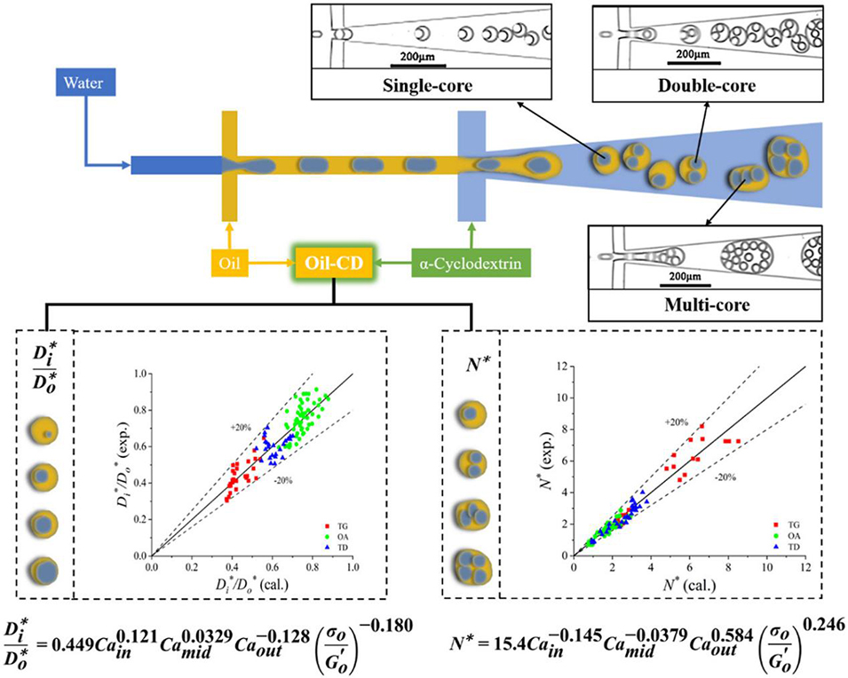 1、本研究开发了一种利用环糊精(CD)稳定多核W/O/W双乳液的微流控策略。通过集成十字交叉和流动聚焦结构的混合芯片,系统研究了油相类型、流速比和CD浓度对液滴形成模式和特性的影响。