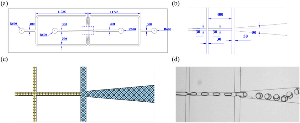 图1. (a)整合十字交叉与流动聚焦结构的混合微流控芯片示意图(单位:微米);(b)芯片放大视图(单位:微米);(c)通道壁润湿性示意图;(d)表面修饰后的双乳液形成过程。