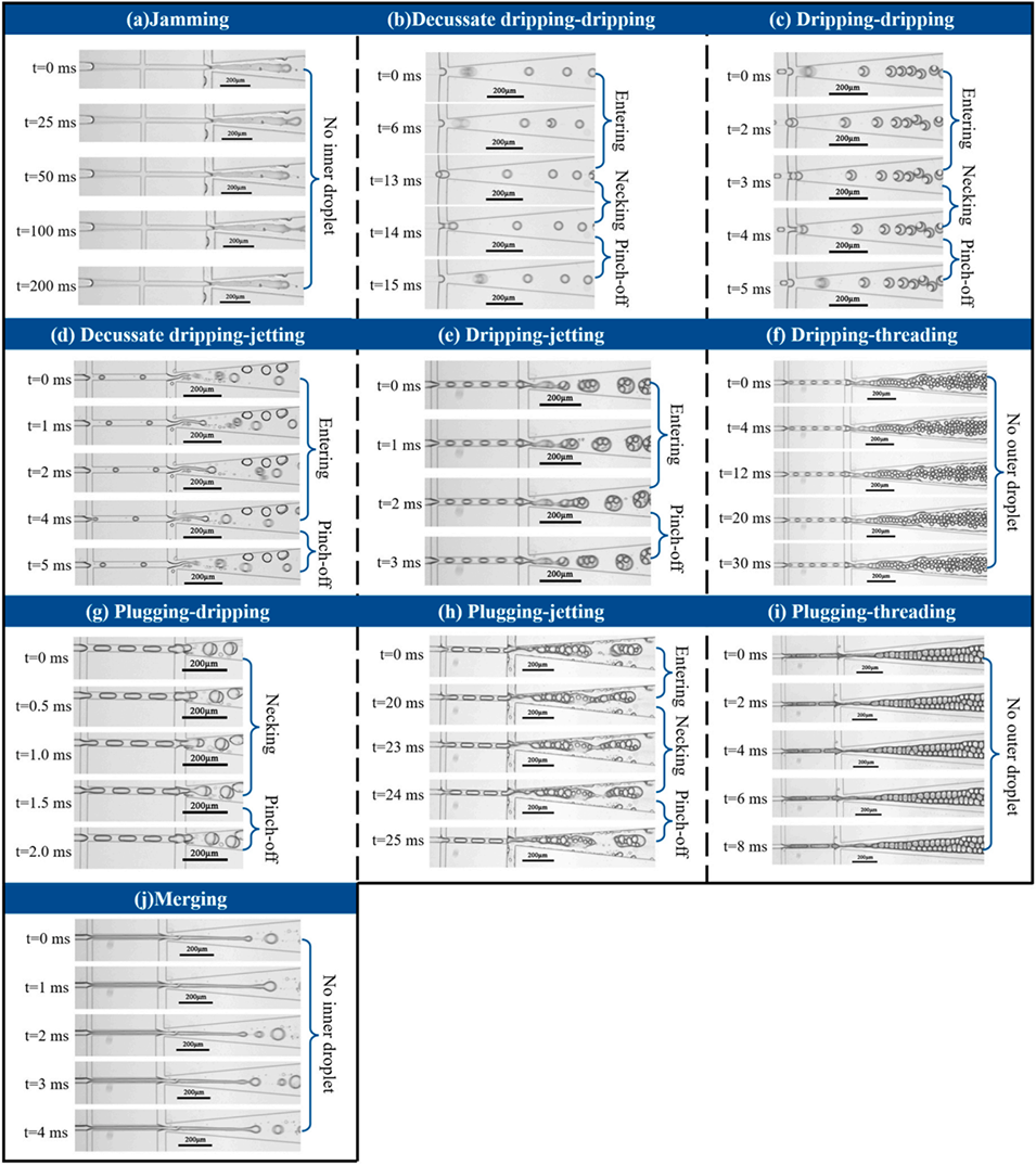 图2. 芯片内的流动模式。(a)堵塞模式;(b)交叉滴落-滴落模式;(c)滴落-滴落模式;(d)交叉滴落-喷射模式;(e)滴落-喷射模式;(f)滴落-拉丝模式;(g)塞流-滴落模式;(h)塞流-喷射模式;(i)塞流-拉丝模式;(j)合并模式。