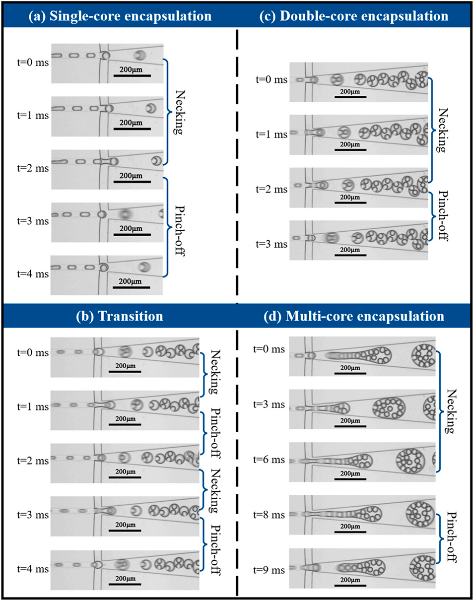 图3. 十四烷(TD)在滴落-滴落模式下的液滴封装形态。(a)单核封装;(b)单核与双核液滴过渡态;(c)双核封装;(d)多核封装。