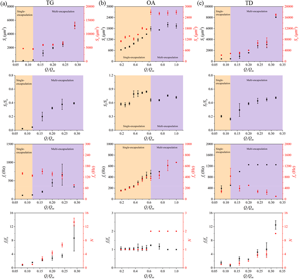 图5. 内相-中间相流速比(Qi/Qm)对液滴特性的影响:(a)甘油三油酸酯(TG)体系;(b)油酸(OA)体系;(c)十四烷(TD)体系。其中液滴特性包括液滴尺寸(内液滴投影面积Si、外液滴投影面积So、尺寸比Si/So)、生成频率(内液滴生成频率fi、外液滴生成频率fo、频率比fi/fo)及封装特性(单核或多核封装)。