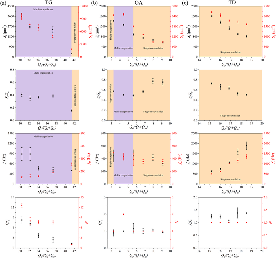 图6. 外相-总流速比(Qo/(Qi+Qm))对液滴特性的影响:(a)甘油三油酸酯(TG)体系;(b)油酸(OA)体系;(c)十四烷(TD)体系。其中液滴特性包括液滴尺寸(内液滴投影面积Si、外液滴投影面积So、尺寸比Si/So)、生成频率(内液滴生成频率fi、外液滴生成频率fo、频率比fi/fo)及封装特性(单核或多核封装)。