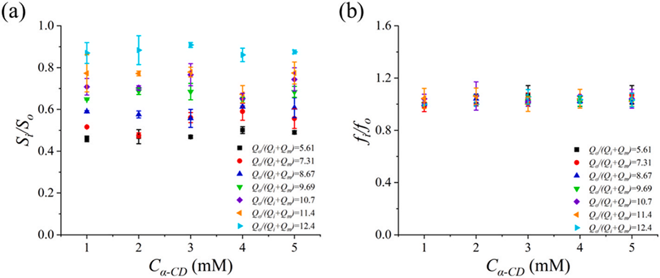图7. 不同流速比下,环糊精(CD)浓度对液滴特性的影响:(a)液滴尺寸比(Si/So);(b)液滴生成频率比(fi/fo)。