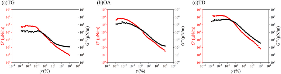 图8. 界面膜的存储模量(G',红色曲线)与损耗模量(G'',黑色曲线)随应变振幅的变化关系:(a)甘油三油酸酯(TG)体系;(b)油酸(OA)体系;(c)十四烷(TD)体系。