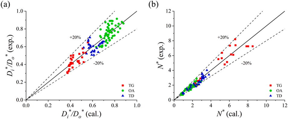 图9. 计算值与实验值的对比:(a)内液滴相对尺寸(Di*/Do*),决定系数R²=0.819;(b)内液滴封装核数(N*),决定系数R²=0.870。其中Di为内液滴等效直径,Do为外液滴等效直径,均由投影面积换算得到。