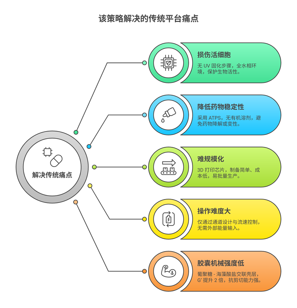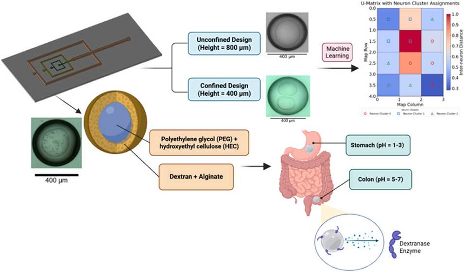 1、本研究开发了一种生物相容性微流控平台,用于制备油包水包水(W/W/O)双乳液,以实现结肠靶向给药。
