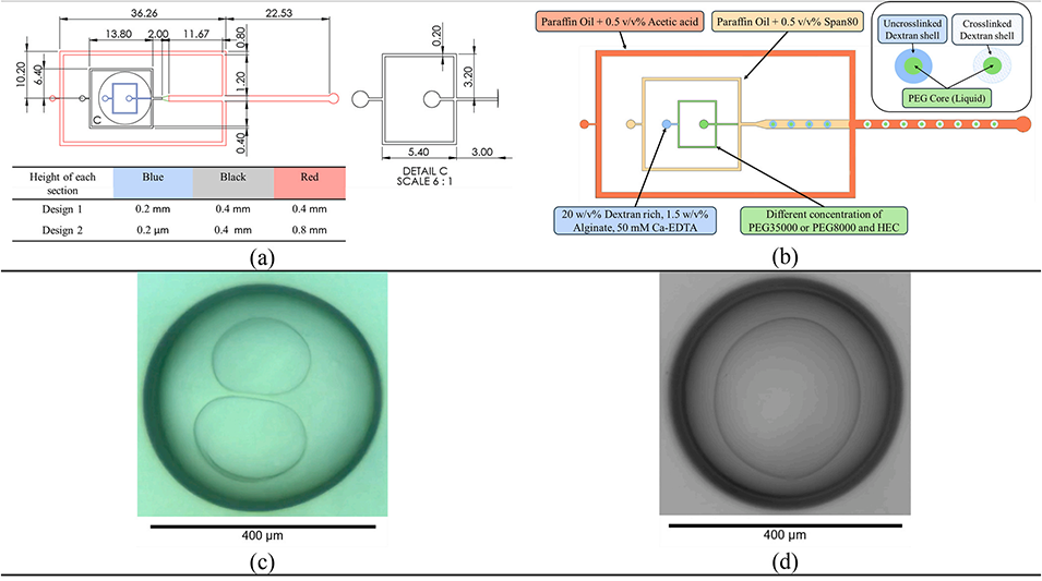 图1:微流控器件示意图:(a)微通道详细尺寸,彩色标注区域表示高度差异;(b)用于形成和交联核壳胶囊的微流控器件整体结构;(c)设计1(受限通道)生成的双芯双乳液;(d)设计2(非受限通道)生成的单芯双乳液。