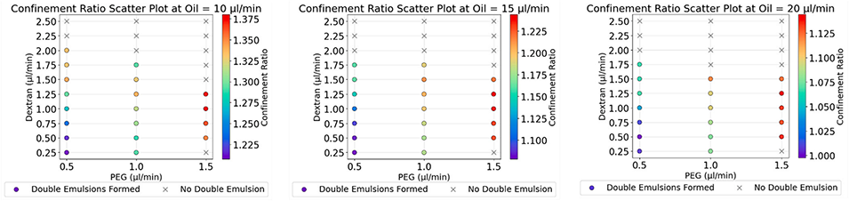 图2:设计1(高度400μm)在不同PEG、葡聚糖和油相流速条件下的垂直限制比。