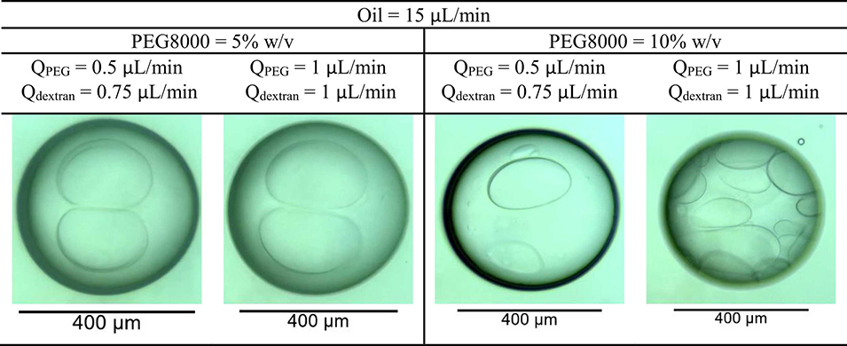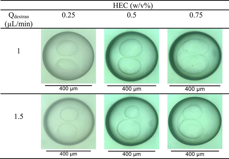 图5:当PEG流速为0.5μL/min时,羟乙基纤维素(HEC)浓度对不同葡聚糖流速下双乳液形成的影响。