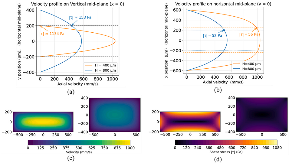 图3:通道设计的流动与剪切应力分析:(a)垂直中平面上的轴向速度分布;(b)水平中平面上的轴向速度分布;(c)轴向速度等高线;(d)剪切应力等高线。