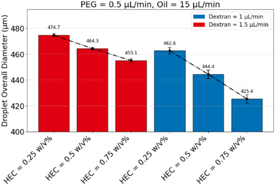 图6:当PEG流速为0.5μL/min时,HEC浓度和葡聚糖流速对双乳液总直径的影响。