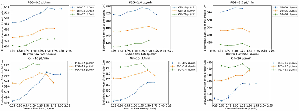 图7:双乳液液滴直径随PEG、葡聚糖和油相流速的变化,标注了滴状(dripping)与挤压状(squeezing)流型的转变点。