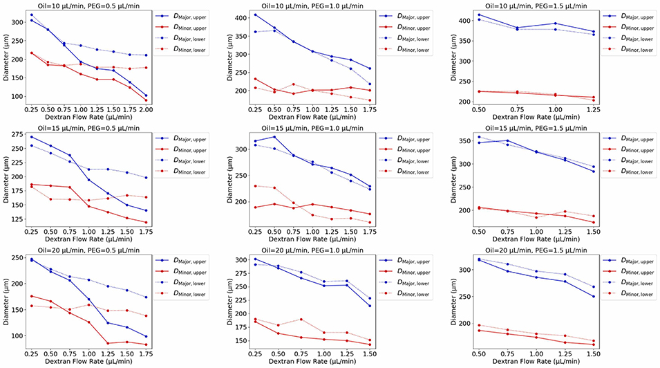 图8:内部核心的形貌分析,详细展示核心长径与短径如何随葡聚糖、PEG和油相流速变化。