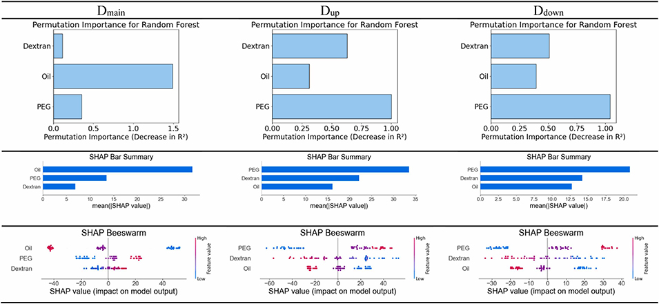 图9:基于随机森林回归、置换重要性和SHAP值的敏感性分析,体现油相、PEG和葡聚糖流速对乳液总直径及核心尺寸的影响。