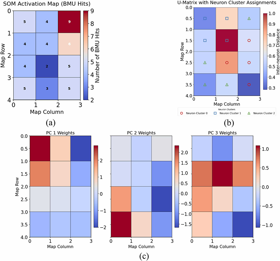 图11:自组织映射(SOM)聚类结果:(a)最佳匹配单元(BMU)命中次数的激活图;(b)指示聚类边界的神经元间距离图(U-矩阵);(c)阐明聚类结构的主成分权重平面。