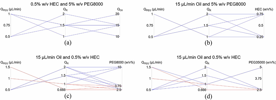 图14:不同聚合物浓度和流速下单芯乳液形成的成功图谱:(a)油相、PEG和葡聚糖流速的影响;(b)HEC浓度的影响;(c)PEG8000浓度的影响;(d)PEG35000浓度的影响。红线表示成功案例,蓝线表示失败案例。