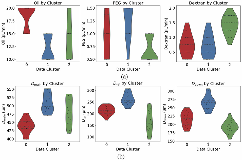 图12:通过小提琴图对各聚类的(a)流速和(b)液滴直径进行分布分析。