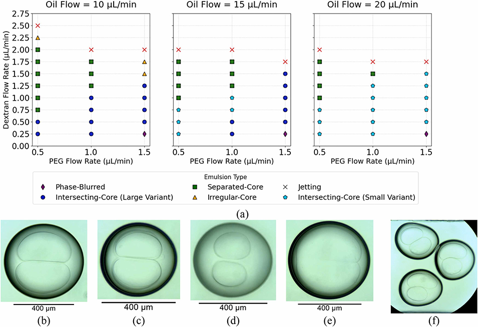 图13:(a)不同流速条件下双乳液结构的可视化分类;(b)交叉芯(大尺寸型);(c)交叉芯(小尺寸型);(d)分离芯;(e)相模糊结构;(f)不规则芯。
