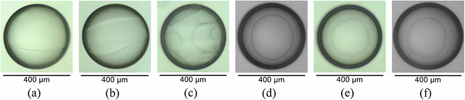 图15:在固定油相流速为15μL/min、HEC浓度为0.5%(质量体积比)的条件下,不同参数组合的双乳液形成情况:(a)PEG流速=0.5μL/min、葡聚糖流速=1.5μL/min、PEG8000浓度=10%(质量体积比);(b)PEG流速=1μL/min、葡聚糖流速=1.0μL/min、PEG8000浓度=10%(质量体积比);(c)PEG流速=1μL/min、葡聚糖流速=1.0μL/min、PEG8000浓度=5%(质量体积比);(d)PEG流速=1μL/min、葡聚糖流速=1.0μL/min、PEG8000浓度=3.75%(质量体积比);(e)PEG流速=1μL/min、葡聚糖流速=1.0μL/min、PEG8000浓度=2.5%(质量体积比);(f)PEG流速=1μL/min、葡聚糖流速=1.0μL/min、PEG35000浓度=2.5%(质量体积比)。
