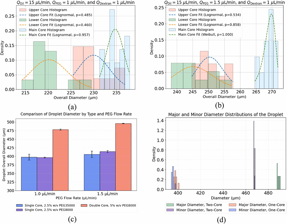 图16:单芯与双芯双乳液的几何特性对比:(a-b)核心直径分布及概率密度函数拟合;(c)乳液总直径对比;(d)长径与短径对比,突出乳液对称性差异。