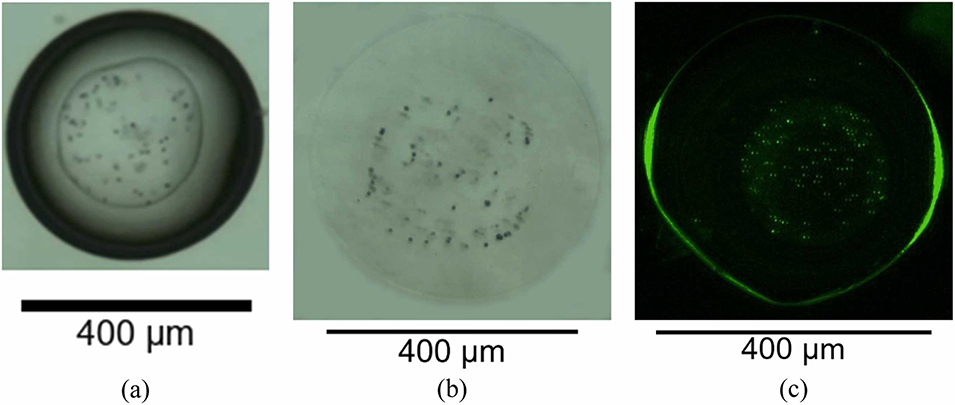 图18:(a)微通道内交联胶囊的可视化图像;(b)清洗后的交联胶囊;(c)交联胶囊的荧光图像。