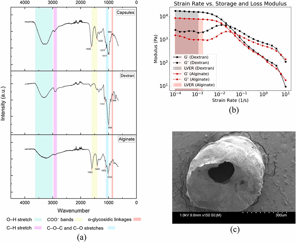 图17:交联胶囊的表征:(a)傅里叶变换红外(FTIR)光谱,验证海藻酸盐-葡聚糖的交联作用;(b)纯海藻酸盐水凝胶与葡聚糖增强型海藻酸盐水凝胶的粘弹性(储能模量G'与损耗模量G'')对比;(c)冻干胶囊的扫描电子显微镜(SEM)图像。