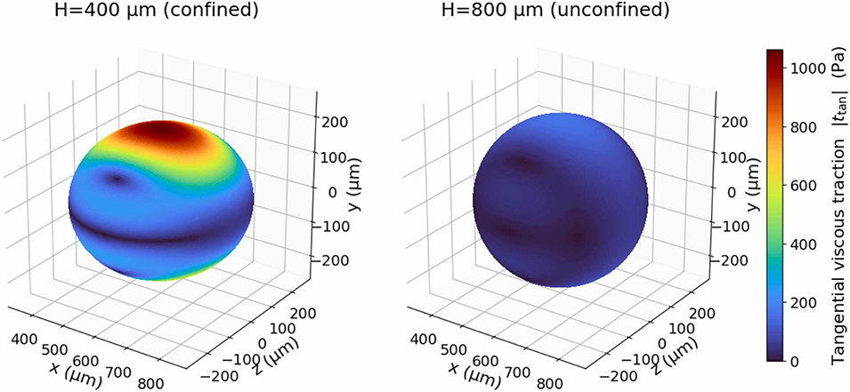 图19:受限(400μm高)与非受限(800μm高)两种设计中,双乳液表面的绝对切向剪切应力等高线。