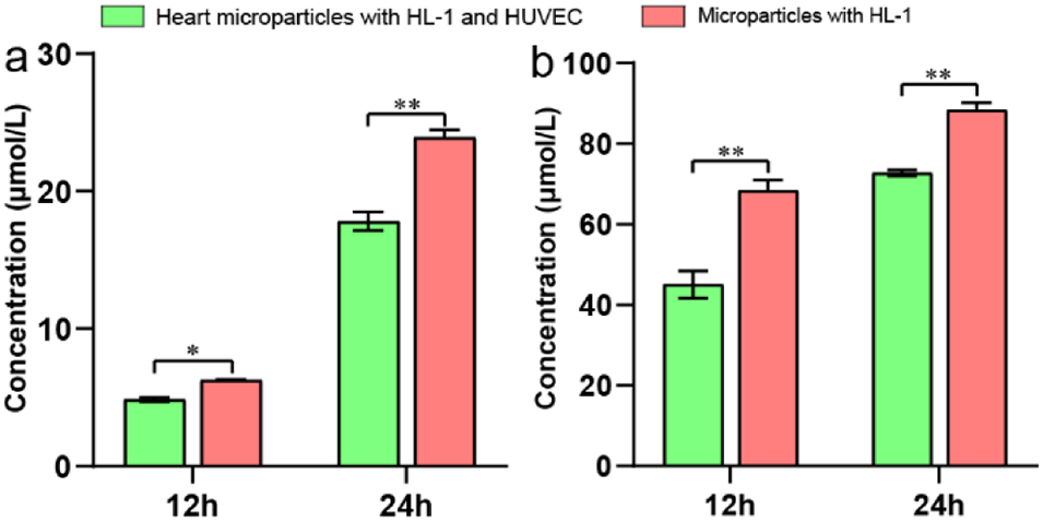 图5. 心脏微球上乌头碱代谢物的定量分析。两种微球中乌头原碱(a)和苯甲酰乌头原碱(b)的含量。n=3。*p<0.05,**p<0.01