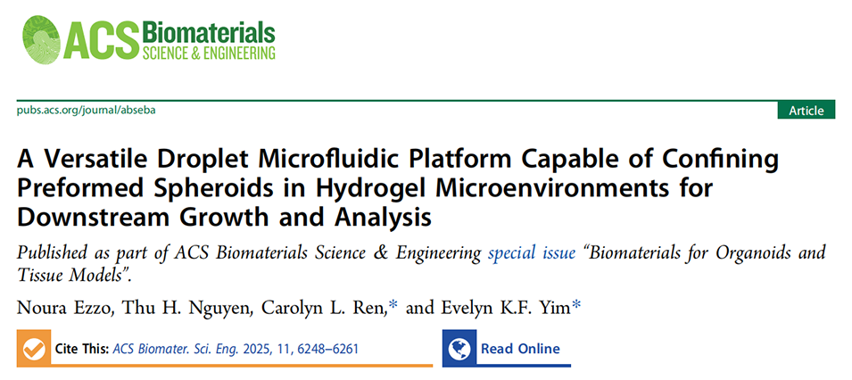 近期,加拿大滑铁卢大学研究团队提出了一种“分步式”新策略:先利用微孔板制备出均一的预成型球状体,再通过其设计的双十字液滴微流控芯片,将这些球状体逐个封装入水凝胶微环境中。该方法仅需极低的初始细胞数量(低至6×10⁴个),便能实现单球状体的精准包裹,并在后续培养中保持了球状体超过80%的高活性与优良的均一性。相关研究以“A Versatile Droplet Microfluidic Platform Capable of Confining Preformed Spheroids in Hydrogel Microenvironments for Downstream Growth and Analysis”为题,发表在期刊《ACS Biomaterials Science & Engineering》上。