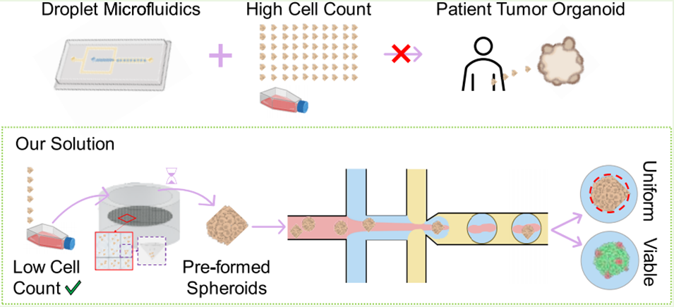 患者来源的肿瘤类器官(PDTOs)是开发个性化治疗方法的极具潜力的3D疾病模型。然而,传统的PDTO制备技术存在诸多局限性,如批次间差异大且通量低。液滴微流控技术(DM)利用微通道生成均一液滴,凭借其高通量与参数可控的优势,在类器官制备领域展现出巨大潜力。但现有大多数液滴微流控装置需极高的初始细胞量(通常为10⁶量级),而活检样本难以获取如此大量的细胞。