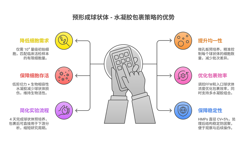 2、该平台采用双十字形通道芯片设计,利用粘性对比的水凝胶产生流体动力聚焦,可将仅含10^4数量级细胞的预成型球体(直径100-200 μm)高效包裹于明确的水凝胶微环境中。