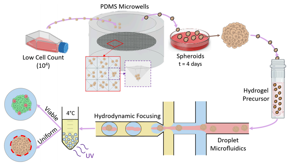 图1 系统操作流程总结:从低细胞量开始形成球状体,随后采用液滴微流控技术将球状体包裹在水凝胶液滴中,并验证其存活率与均一性。