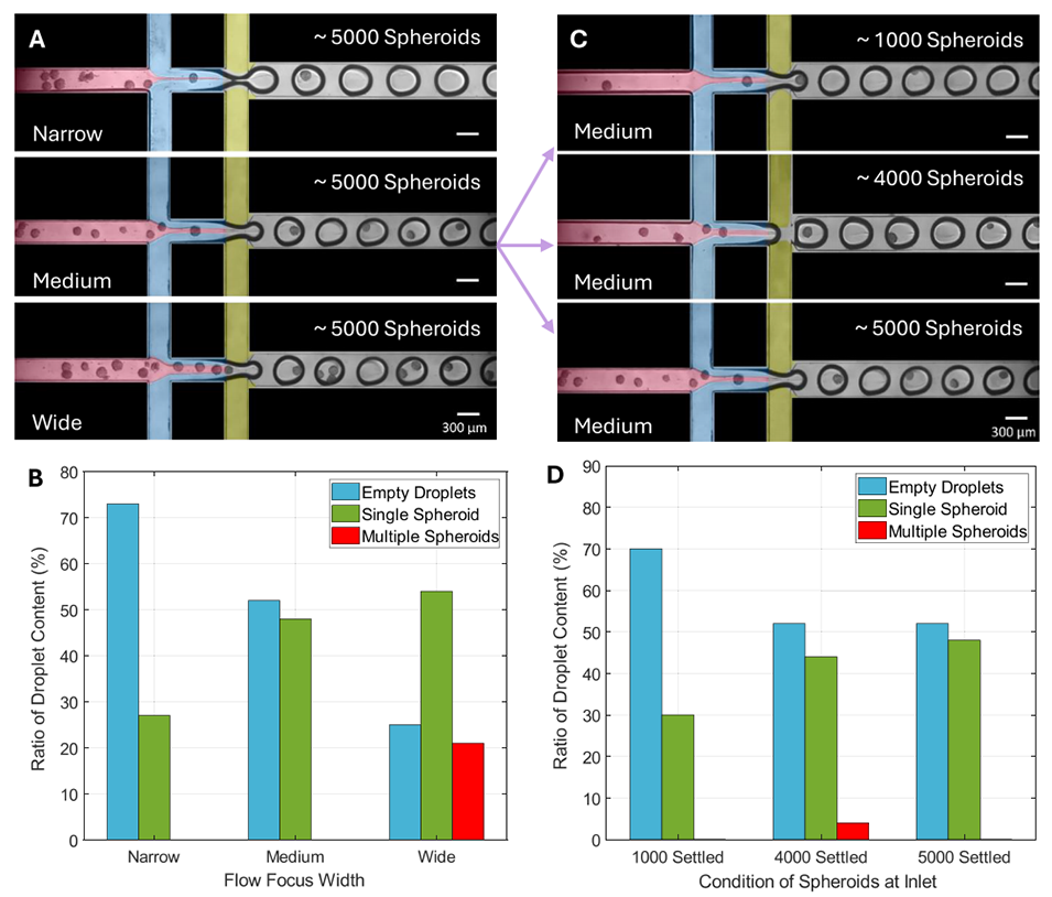 图4 (A)不同流体聚焦宽度(FFW)的伪彩色图像,便于区分流体流束:(i)窄宽度(为 WD1 的 20%)、(ii)中等宽度(为 WD1 的 30%)、(iii)宽宽度(为 WD1 的 40%)。球状体数量固定为 5000 个,悬浮于 500μL 5% 质量体积分数 GelMA 中作为分散相 1(D1,粉色),分散相 2(D2)为 2.5% 质量体积分数 GelMA(蓝色)(粘度比 η≈2.5),连续相(黄色)为含 3% 体积分数 Span 80 的矿物油。聚焦宽度通过调整 D1 的压力实现变化。(B)不同 FFW 条件下的包裹效率示意图,对比了液滴中球状体的含量分布。随着 FFW 增大,单球状体包裹的液滴数量增多。(C)在入口储液池中加入不同浓度球状体时装置运行的伪彩色图像:球状体悬浮于 500μL 5% 质量体积分数 GelMA 中,流体条件与(A)一致,FFW 保持中等宽度。(D)不同入口球状体浓度下的包裹效率示意图,对比了液滴中球状体的含量分布。初始球状体数量越多,可被包裹进水凝胶液滴的球状体数量越多;但即使在低球状体数量下,仍能实现有效的包裹。比例尺 = 300μm。