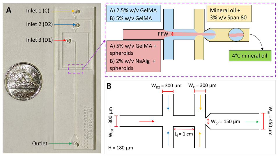 图2 (A)完整的液滴微流控(DM)芯片及尺寸标注,显示装置的入口与出口:入口 1 为连续相(C),即含 3% 体积分数 Span 80 的矿物油(黄色);入口 2 为分散相 2(D2),即低粘度水凝胶前体(蓝色);入口 3 为分散相 1(D1),即含球状体的高粘度水凝胶前体(粉色)。出口处为用于收集液滴的 4℃矿物油(绿色)。放大示意图展示了本研究中使用的流体条件,其中流体聚焦宽度(FFW)以粉色标注。(B)DM 芯片在通道连接处的几何结构示意图,标注了通道尺寸与流体流向。