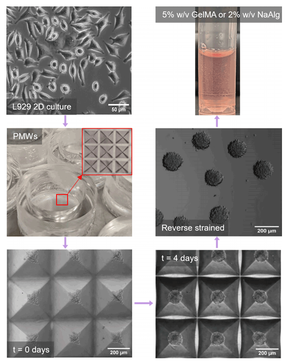 图3 利用 PDMS 微孔板复制品形成均一球状体的流程总结:以低至 6×10⁴个细胞的 L929 细胞悬液为起始材料,将其加入 PDMS 微孔板(PMWs)中并均匀分配至各微孔内。细胞在 4 天内聚集形成均一且致密的球状体。对球状体进行反向过滤处理,得到均一的球状体批次,随后将其加入用于 DM 装置的水凝胶前体中。