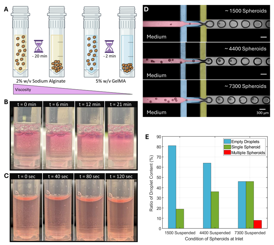 图5 (A)基于水凝胶前体粘度的球状体沉降时间示意图:粘度越高,球状体沉降速度越慢。(B)约 4000 个球状体悬浮于 500μL 2% 质量体积分数海藻酸钠(NaAlg)中:球状体在约 20 分钟后出现明显沉降,每 3 分钟观察一次并记录关键图像。(C)约 4000 个球状体悬浮于 500μL 5% 质量体积分数 GelMA 中:球状体在约 2 分钟后出现明显沉降,每 20 秒观察一次并记录关键图像。(D)入口储液池中加入不同浓度球状体时装置运行的伪彩色图像:球状体悬浮于 500μL 2% 质量体积分数 NaAlg 中作为分散相 1(D1,粉色),分散相 2(D2)为 5% 质量体积分数 GelMA(蓝色)(粘度比 η≈9),FFW 保持中等宽度,连续相(黄色)为含 3% 体积分数 Span 80 的矿物油。比例尺 = 300μm。(E)不同入口球状体浓度(悬浮于 2% 质量体积分数 NaAlg 中)的包裹效率示意图,对比了液滴中球状体的含量分布。