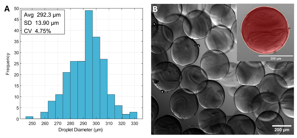 图 7 (A)收集并交联后的水凝胶微粒(HMPs)的液滴分布(n=231)。(B)收集后空液滴的明场图像,示例液滴中标注了液滴直径的测量方式(黄色轮廓线)。比例尺 = 200μm。