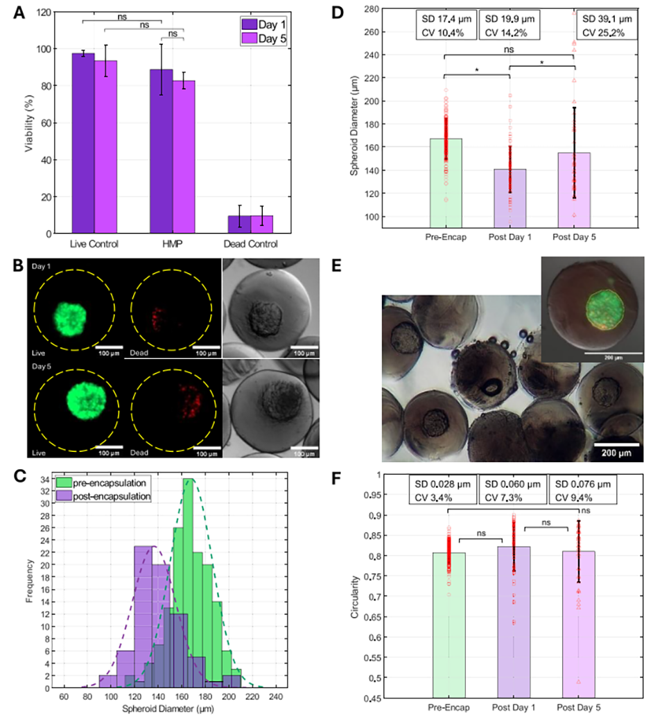 图 6 采用以下液滴微流控流体条件对包裹在水凝胶微粒(HMPs)中的球状体进行分析:分散相 1(D1)为 2% 质量体积分数 NaAlg,分散相 2(D2)为 5% 质量体积分数 GelMA,连续相(C)为含 3% 体积分数 Span 80 的矿物油,在 4℃矿物油出口处收集液滴。(A)包裹后 1 天和 5 天的球状体存活率,数值为四个不同批次的平均值。(B)活/死染色实验图像示例:展示了包裹后 1 天和 5 天的荧光图像(活细胞为绿色,死细胞为红色)及对应的明场图像。比例尺 = 100μm。(C)包裹前 1 天与包裹后 1 天的球状体直径分布,附对应的高斯分布曲线(虚线)。(D)包裹前(Pre-Encap,n=152)、包裹后 1 天(Post Day 1,n=71)和包裹后 5 天(Post Day 5,n=46)的球状体平均直径统计图,红色圆点代表各样本数据。(E)包裹后 1 天含球状体液滴的明场图像,示例液滴中标注了球状体直径的测量方式(黄色轮廓线)。(F)球状体平均圆形度统计图,格式与(D)一致。比例尺 = 200μm。(* 表示 p<0.05,具有统计学显著性)。
