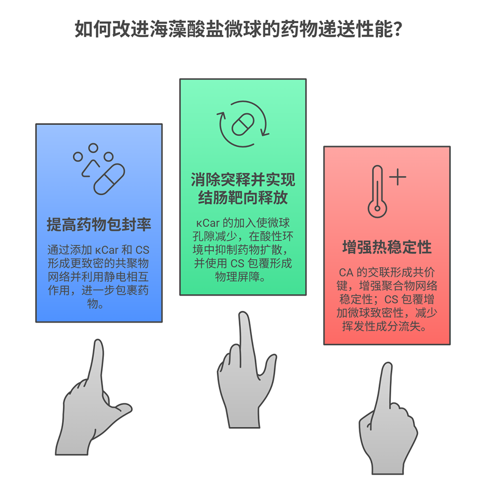 3、FE-SEM图像显示微球形态规则、尺寸分布窄;TGA分析表明Alg-CA-κCar/CS微颗粒具有更佳的热稳定性。