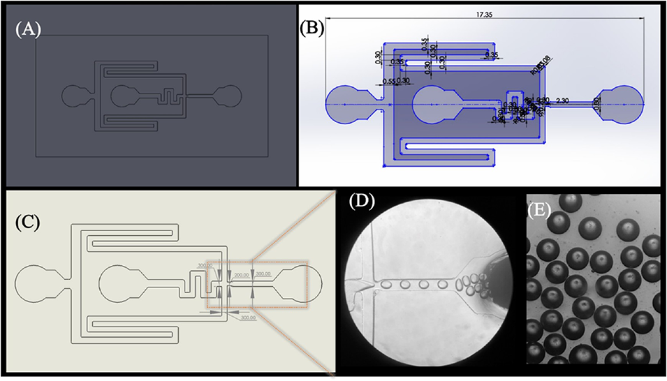图1.(A)3D打印模具的SOLIDWORKS设计图;(B)芯片微通道尺寸图;(C)完全制备好的聚二甲基硅氧烷(PDMS)微流控芯片;(D)通道内液滴生成的显微图像;(E)单分散性海藻酸盐-柠檬酸-κ-卡拉胶/壳聚糖@美沙拉嗪(Alg-CA-κCar/CS@Mes)液滴。